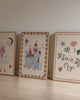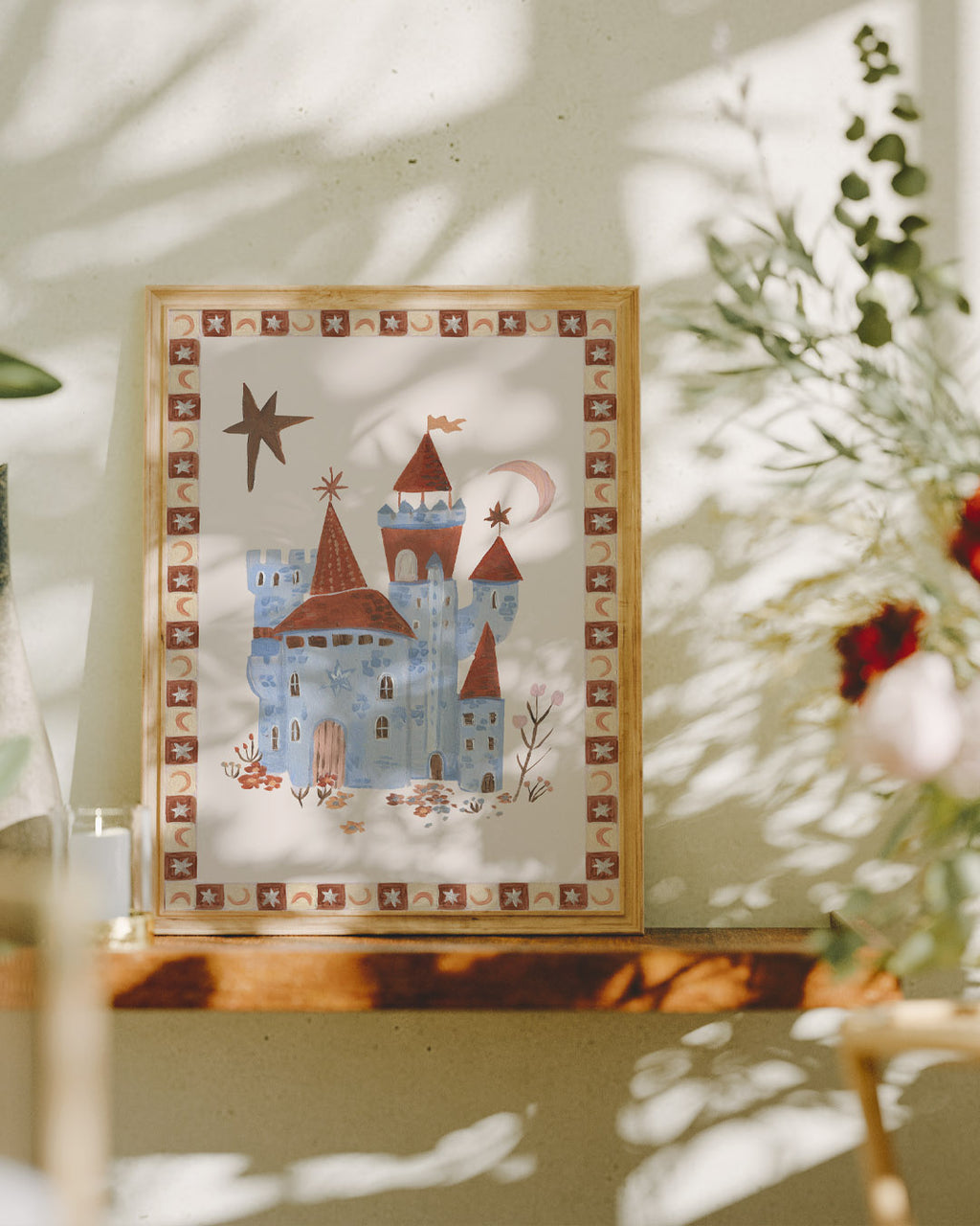 A hand-painted acrylic castle art print from the Once Upon a Time collection. Our whimsical blue fairytale castle features tiledrooftops, stars, and a crescent moon.